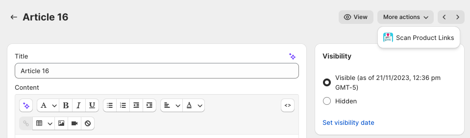 Alternatively, if you would like to scan a new article or an article that you have updated, in the article under "More actions", click "Scan Product Links".