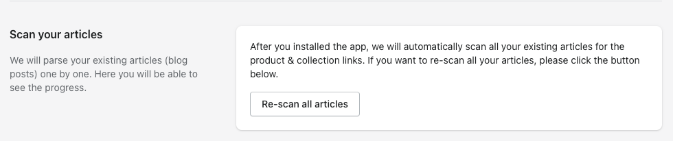 If the pop-ups doesn't work, it's handy to scan the articles again. This is done by clicking on 're-scan all articles' which can be found under settings. You must use this button if you have created a new article with product links or if you have modified an article.